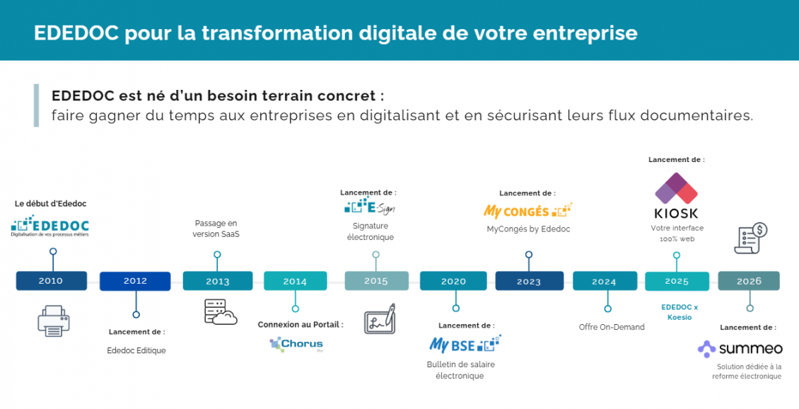 Solution clé en main d’édition et de dématérialisation de documents, EDEDOC permet de concevoir, diffuser et archiver factures, bulletins de paie, contrats et courriers en toute sécurité, tout en simplifiant les processus métiers des TPE et PME.